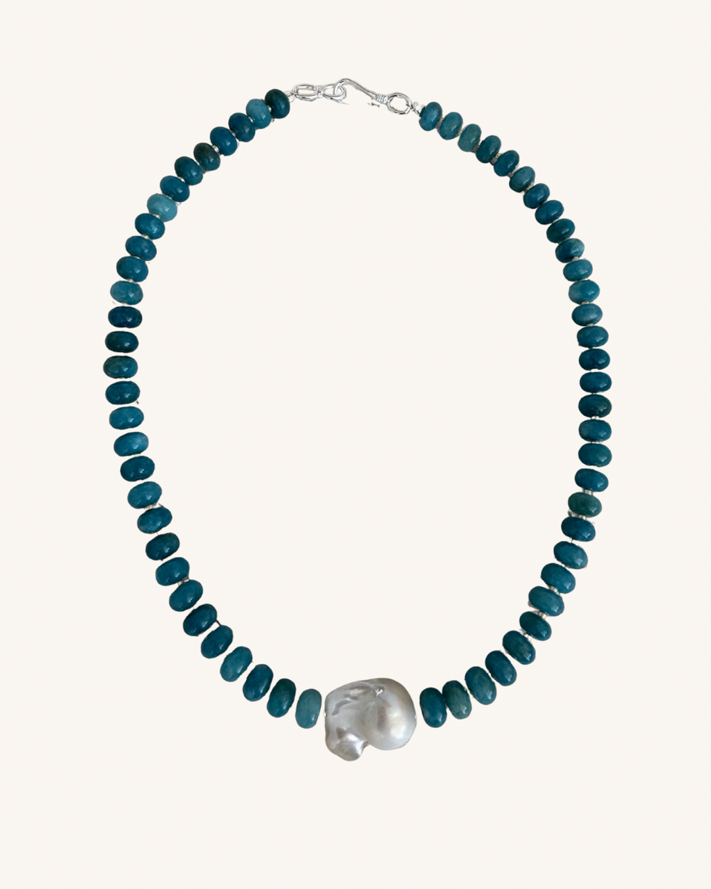 The Cherry Necklace by Paloma Pieces features one large Baroque Pearl, surrounded by Blue dyed Jade Rondelle Stones and Silver Japanese Seed Beads with 14k Silver plated hardware. The Cherry Necklace is an everyday piece for those who love colour and the option of layering.
