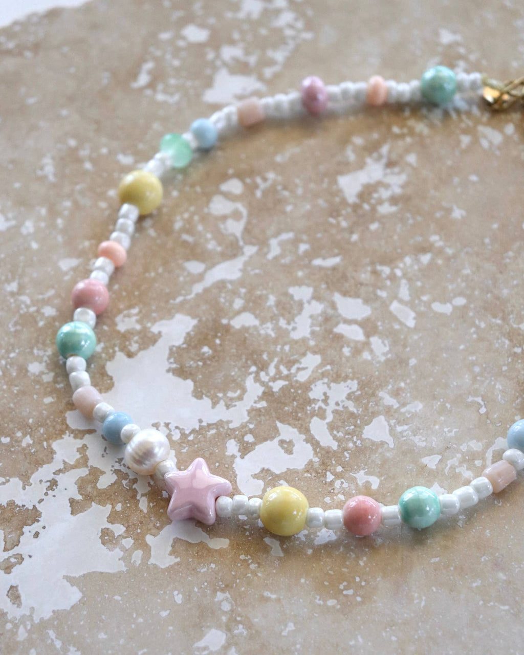 Whimsical moments with little ones playing dress-ups and imagining fairy kingdoms…. xx Materials - Recycled glass beads and glazed ceramics. Corded onto a gold Stainless steel clasp. Make those memories x