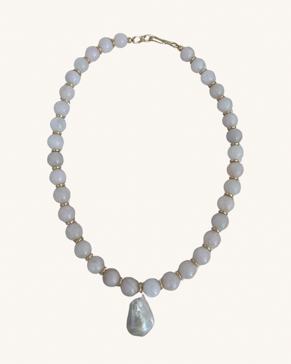 The Dezi Necklace by Paloma Pieces features one large Baroque Pearl, Rose Quartz 10mm beads and 14k Gold plating. Each piece includes tarnish resistant protective coating to ensure the longevity of these everyday statement necklaces.
