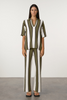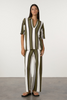 A soft boucle-textured knit with a mid-weight, gentle drape. This boyfriend-style shirt features an open collar and elbow-length sleeves, designed in a timeless wide green and white stripes. With a distinctly nostalgic '70s feel in both fabric and silhouette, it pairs perfectly with the matching olive stripe knit pant for a coordinated set look.