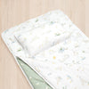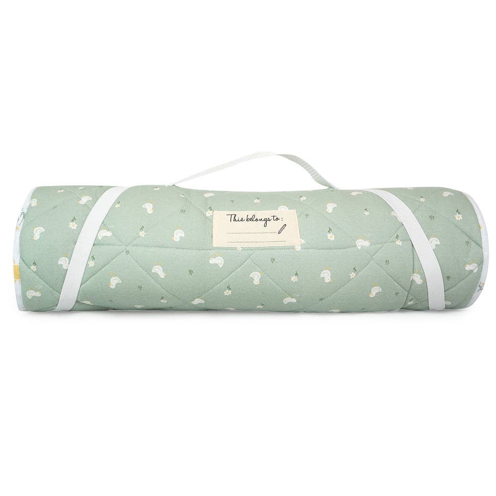 Designed in conjunction with leading childcare centres, our Deluxe Nap Mats are not only super practical but look great too. Sized to fit day-care stacking beds perfectly, each nap mat has 4 elastic loops to secure the mat to the bed to ensure it stays in place even through tosses and turns. Alternativity our nap mat can be directly placed on sleeping mats on the floor. Features: * Durable 100% organic cotton jersey outer * Cotton jersey inner that's soft and snugly against your little one's skin * Quilted base for extra comfort * 4 elastic loops to stretch over daycare bed legs for a secure fit * It fits all stacker beds and sleeping mats * Rolls up small and secures with elastic loops * Sewn-on "This belongs to" name label and built-in handle * Removable 100% organic cotton outer pillow with hypo-allergenic moisture-resistant filling * Machine Washable * stacking bed is not included Note: We are part of the NSW Childcare Alliance.