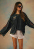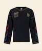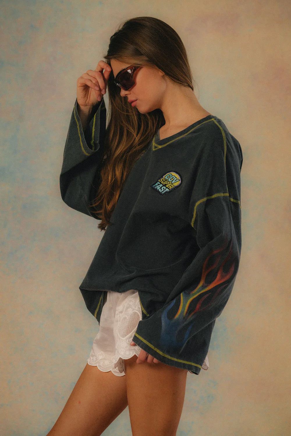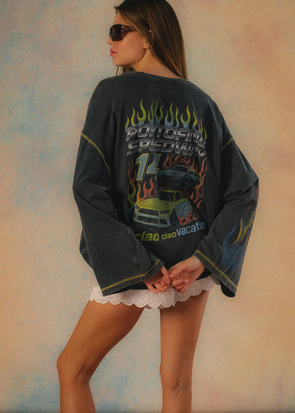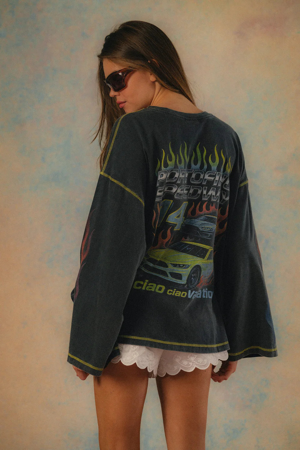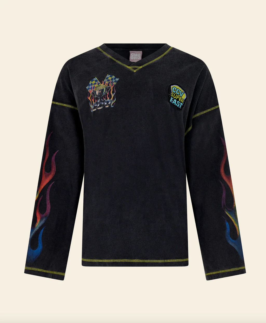 A washed charcoal long sleeve with flame graphics and racing-inspired prints, finished with contrast stitching for that worn-in, off-duty edge.